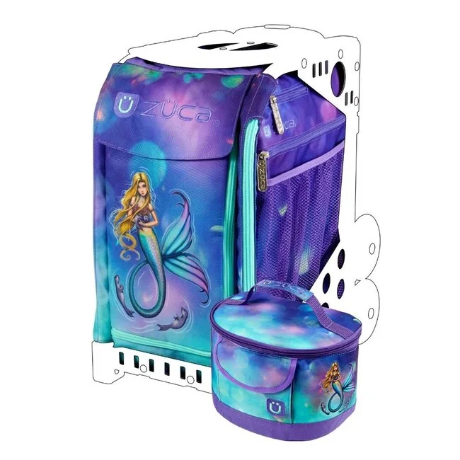 Make every day magical with this dreamy mermaid bundle showcasing enchanted deep-sea scenery in purple, pink and aqua watercolors. Swimming alongside her sealion sidekicks, the alluring mermaid welcomes you to join her in her underwater world of wonder. The matching bag and lunchbox pair are uniquely captivating, whimsical, and practically perfect!